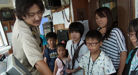普段は入室できない操舵室に入らせてもらい、船を操縦する機械の説明を聞く子どもたち。レーダーの説明に興味津津。(8/19サンタマリア)