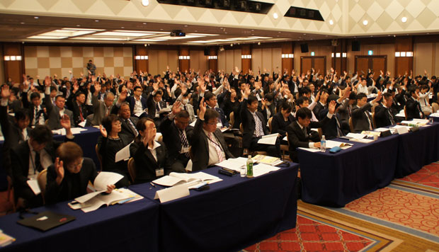 さらに2019年に結成30周年を迎えるにあたり、持続可能な社会に向けての運動を作りあげていくとした大会宣言を採択。最後に山﨑会長の発声のもと団結ガンバローを三唱し、大会を締めくくった。