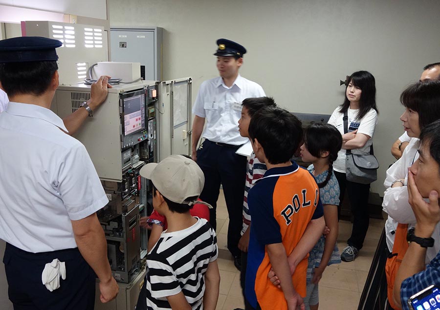 券売機の裏側で、機械の構造や操作について説明を受ける子どもたち。投入されたお金がどのように仕分けられるのか、どのように切符が発券されるかを見学した(7/27鉄道研修センター)