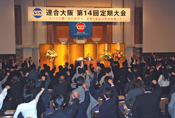 連合大阪は10月23日、「すべての働く者の連帯で希望と安心の社会を築こう」のスローガンを掲げ、結成20周年を記念する第14回定期大会と記念式典・レセプションを大阪市内のホテルで開いた。