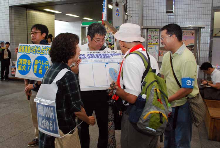 模倣1円玉シールには、228人(円)が引き上げに賛同し、アンケート調査では384人中、285人(74%)が1,000円以上を求め、厳しい生活実態がうかがえた。連合大阪は、地域で消費を刺激するためにも、大幅な最低賃金の引き上げによる賃金の底上げ・格差是正で、暮らしの底上げを図っていくことを訴えた。